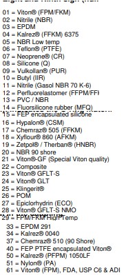 | Component | Material | Material standard | Operation temp | Seal | Flat seal |