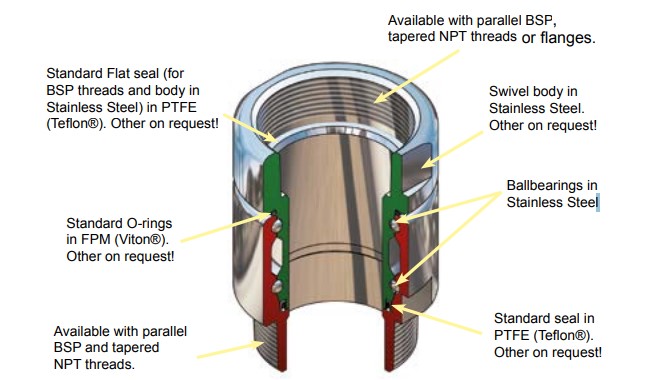 The swivel Heavy duty is designed especially for hose rails to load and unload products like Aliphatic and Aromatic hydrocarbons, Alcohols and Amines, Ether and Ester, Glycos and Water, Liquid Fertilizers, Acids and Lyes.